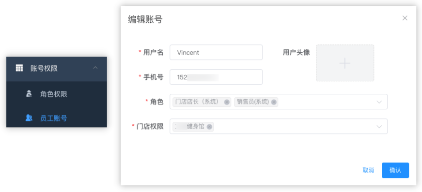 在员工账号管理中,可以为每个员工分配角色以及绑定门店